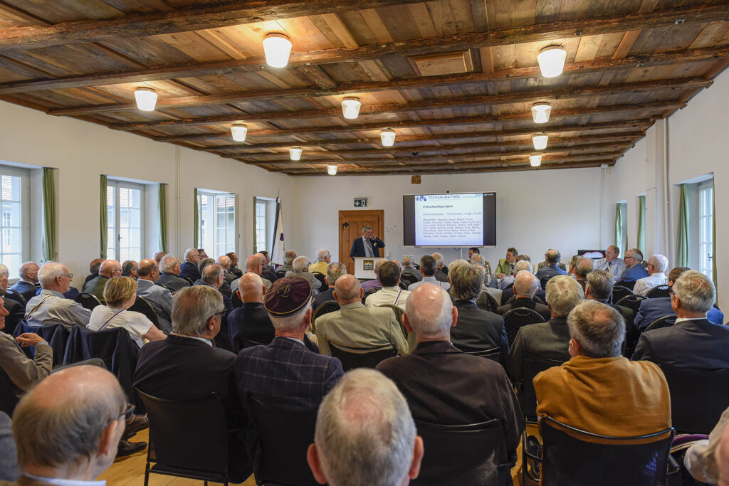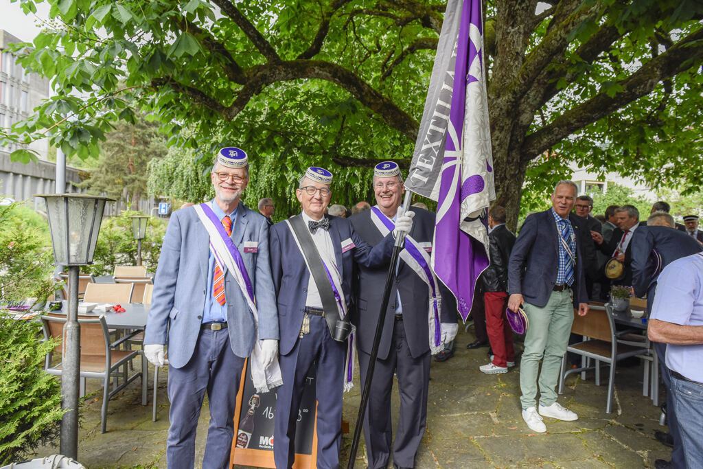 Bei der STF konzertierten die Trommler bis auch der letzte Textilianer zum Gruppenfoto um die Fahne aufgestellt war. Der alte Webmaschinensaal präsentierte sich der Gesellschaft aufwendig dekoriert. Farbenkantus mit Einzug der Fahne. Die beiden alten Fahnen warteten auf ihre hübsche, junge Kollegin.