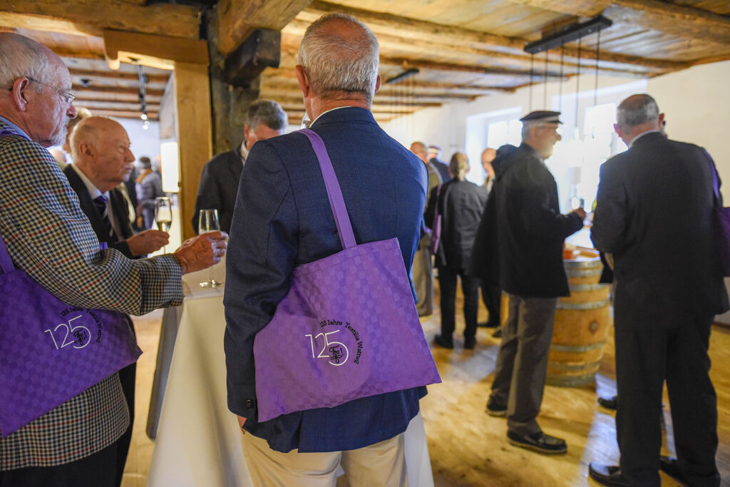 Nach Festkartenausgabe in den Hotels bei Bier resp. Wein und Brezel fuhren wir gemütlich mit dem Bus ins National nach Wattwil. Zum Glück hatte der Regen aufgehört, und so genossen wir den Apéro im Garten unter der grossen Kastanie. Punkt 18 Uhr Abmarsch der Textilianer in Richtung STF. Die Fahne voraus. Vier Tambouren gaben den Takt für die Schrittkadenz. Für einige ältere Herren wohl etwas zu schnell, so dass sich der Cortège gar in die Länge zog.