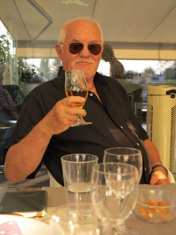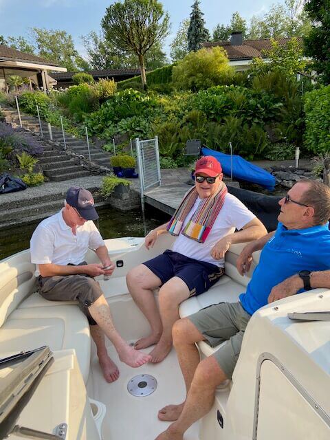 Die Gastgeber empfingen uns auf ihrem Strand-Landsitz mit einem herrlichen, kühlen Weisswein und leckerer Bruschetta. Etwas später folgte dann der bereits traditionelle Ausflug aufs Wasser Mit schäumender Heckwelle gings ab Richtung Stampf Jona und mit ebenso viel Dampf dann wieder zurück. Dazwischen gemütliche Sightseeing-Fahrten mit 5, 6 km/h. Kaum zurück, wurden Teller und Gläser gewechselt und bald schon labten wir uns an ausgezeichneten Steaks, die dank des Feldschlösschens (siehe Bild von Dispo am Grill) hervorragend mundeten. Auch ohne den – im alten Badhüsli von Unggle – obligaten Limburger wurde es spät und dunkel, bis wir uns von den Gastgebern verabschiedeten. Die neun Wädistämmler haben einen bestens organisierten kulinarischen, unterhaltsamen Stamm genossen. Und auch die Anwesenheit eines „Fremden“, der sich sichtlich wohl fühlte in seiner alten Umgebung.