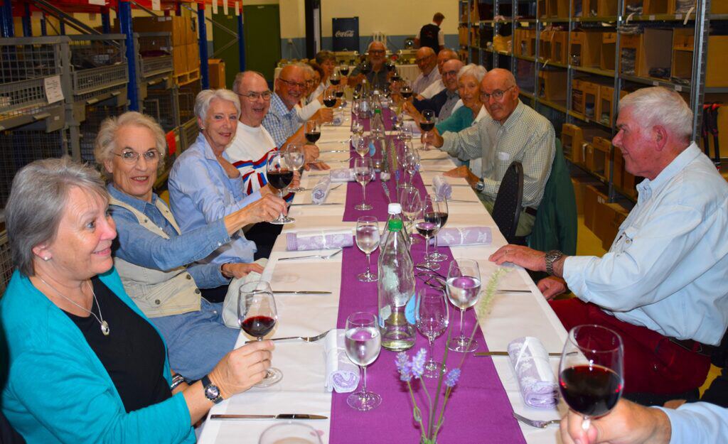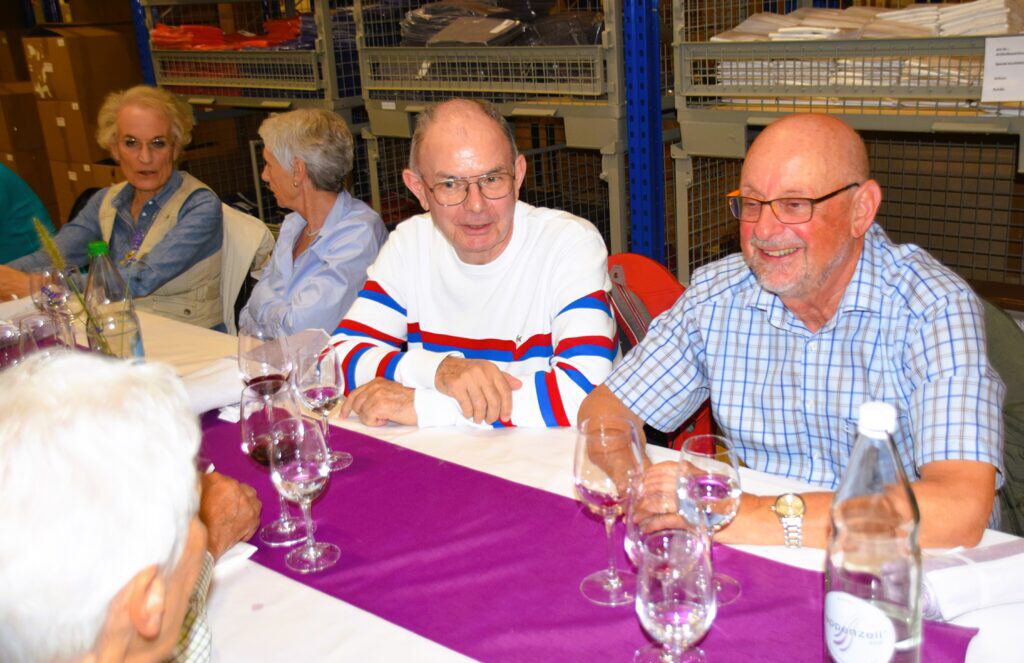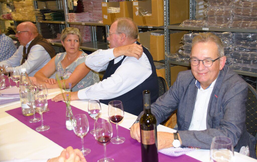 Rigolo hat uns nach der Besichtigung zu einem feinen Nachtessen mit Vorspeisen, Hauptgang und Dessert eingeladen. Serviert wurde es in seinem Betrieb von einer Cateringfirma. Der lange Tisch war natürlich mit den Farben der Textilia dekoriert und jeder fand ein Geschirrtuch als Geschenk an seinem Platz.
