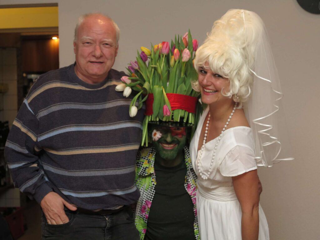 Ein nicht geplanter Höhepunkt ereignete sich um viertelvorzehnuhr. Phon hatte nämlich eine vor dem Stammlokale durchrauschende Braut erblickt, welche er dann durch die Wirtin ins Stammlokal führen liess, was wiederum den Jüngeren der beiden unbeweibten Wädistämmler – siehe Fotos – Glückshormone in nie gekanntem Ausmass ausschütten liess. Anschliessend präsentierte sie sich auch noch mit ihrem Brautstrauss.