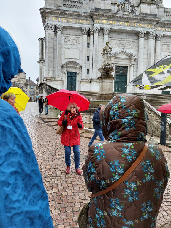 Die kompetente Führerin musste uns nicht speziell auf Corona-konforme Abstände hinweisen, das übernahmen die aufgespannten Schirme. Einzig in den beiden imposanten Gotteshäusern, der St. Ursen-Kathedrale und der Jesuitenkirche, waren wir am Trockenen.