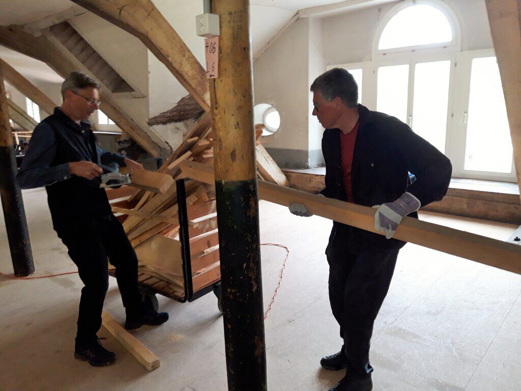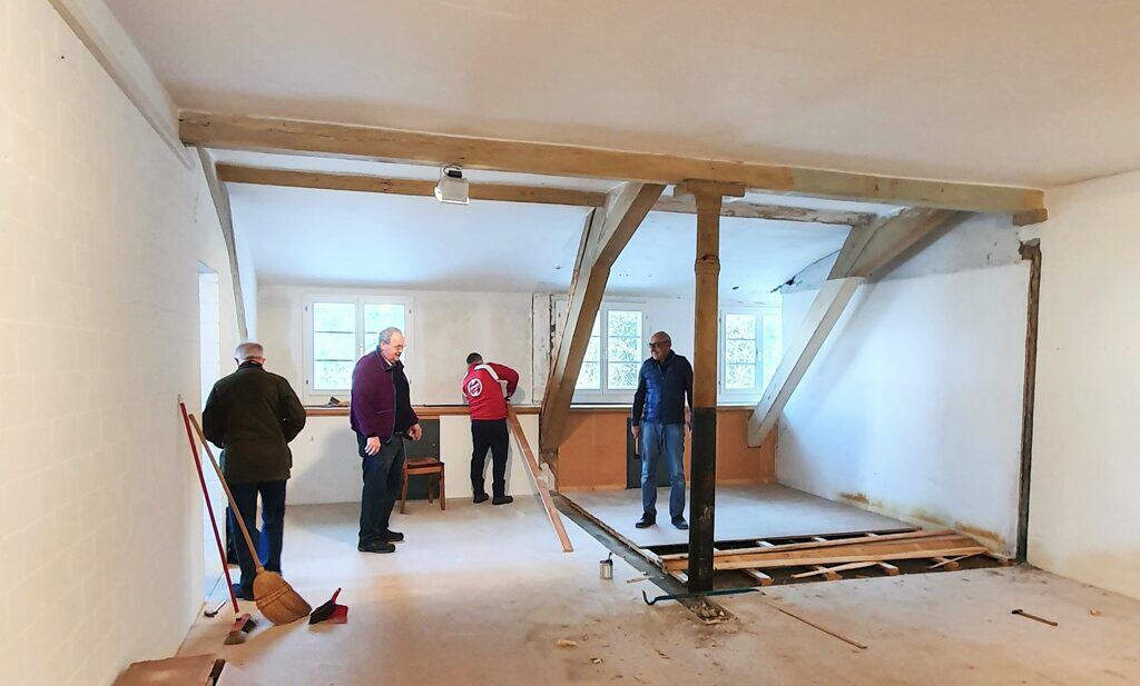 Hochmotiviert haben sich alle an die Arbeit gemacht. Nach kurzer Zeit war absehbar, dass die Arbeit äusserst zügig vorankommt. Somit konnte sich die Projektgruppe mit Balu, Kick und Romeo über die zwischenzeitlich eingegangenen Angebote der Handwerker beugen und die Muster für den Bodenbelag studieren. Als nächstes kommen die Gespräche mit Elektriker, Gipser und Zimmermann mit dem Ziel recht bald die Aufträge zu erteilen.