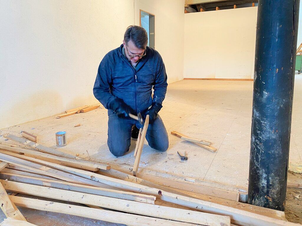 Wir haben den Entscheid gefällt, dass wir aus Sicherheitsgründen (Brandschutz) auf die Freilegung des alten Industriebretterbodens verzichten und stattdessen die Lücken im vorhandenen Unterboden dämmen und ergänzen und am Schluss den ganzen Raum mit einem gesponserten Vinylboden in Holzoptik ausstatten.