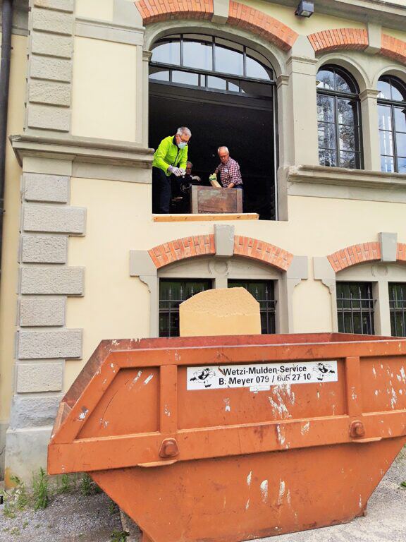 Nach den Besprechungen wollte die Projektgruppe die Chrampfer unterstützen. Doch im 4. Stock war es ruhig und alles schon aufgeräumt und zusammengekehrt. Im ersten Stock hat es gerade noch gereicht aus dem Torfenster die vollle Mulde zu fotografieren. Dann wurden die Fensterflügel wieder eingehängt und die ursprüngliche Ordnung hergestellt. Es war noch nicht einmal 12 Uhr.